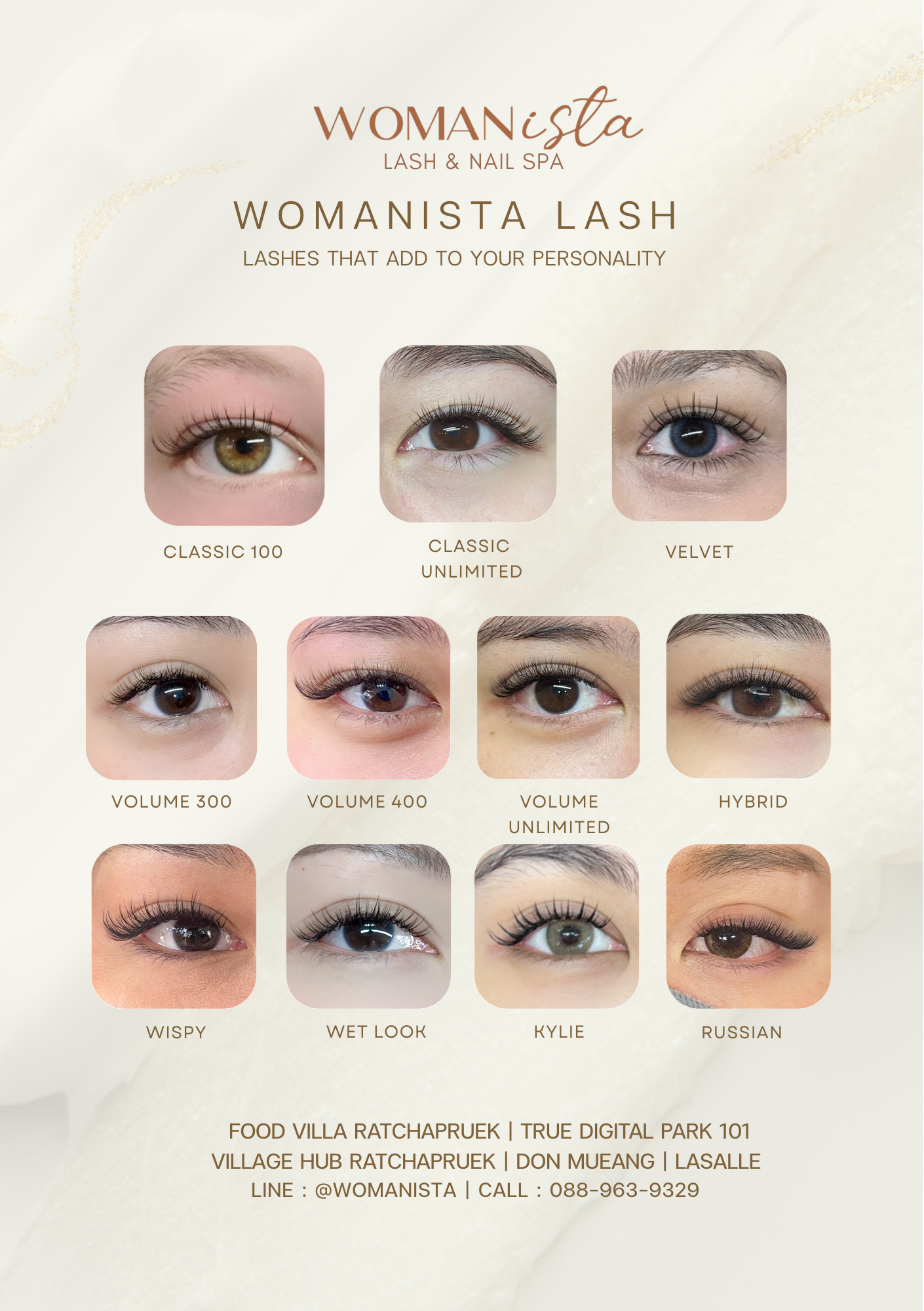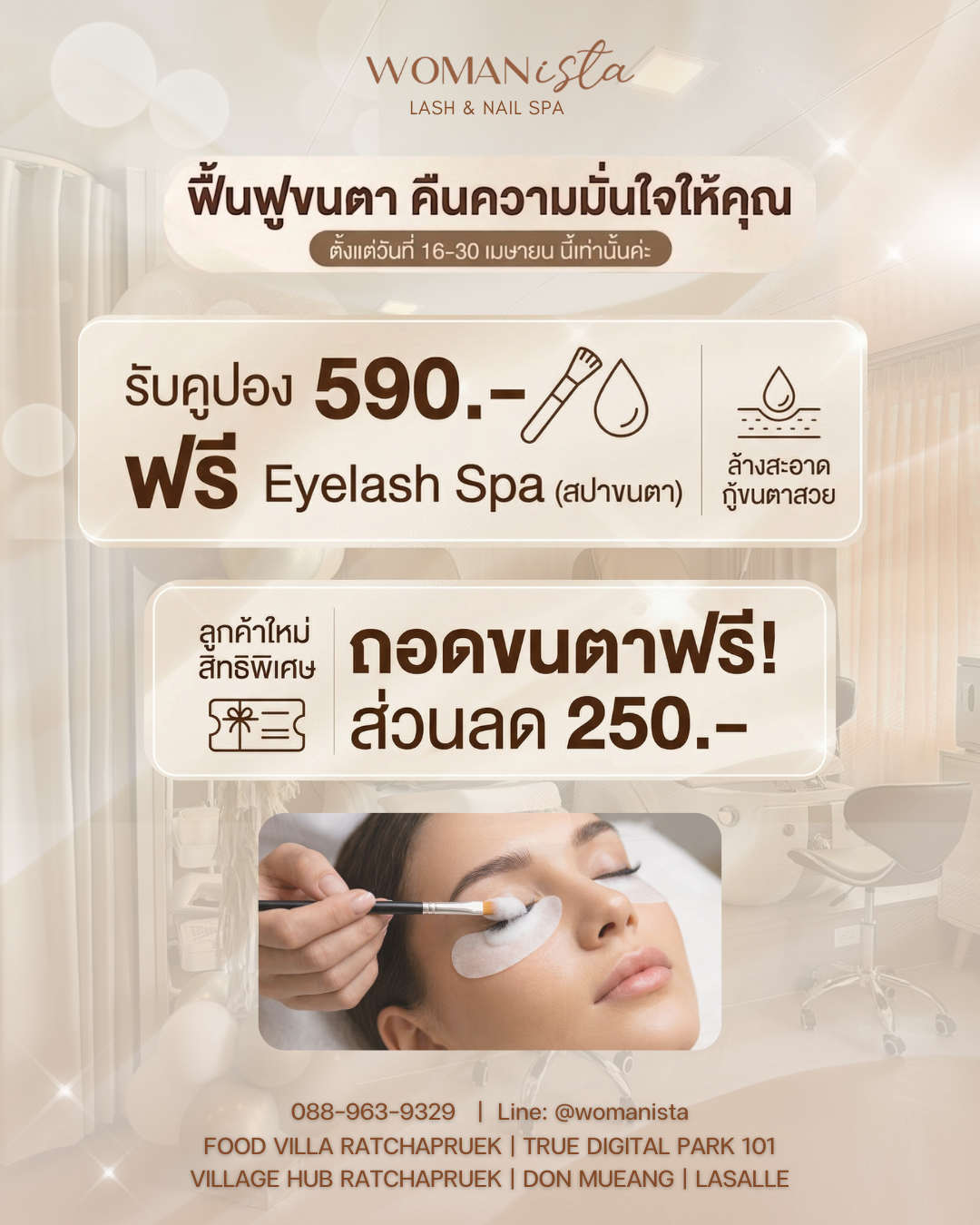 บริการต่อขนตาด้วยเทคนิคพิเศษของทางร้าน ใช้ขนตา Synthetic Mink Eyelash ทำจากขนมิ้งค์สังเคราะห์ชนิดพิเศษ ทำให้ขนตามีน้ำหนักเบา มีความหนาของเส้นที่หลากหลาย สามารถต่อได้ทั้งแบบเส้นต่อเส้นและแบบจับช่อ