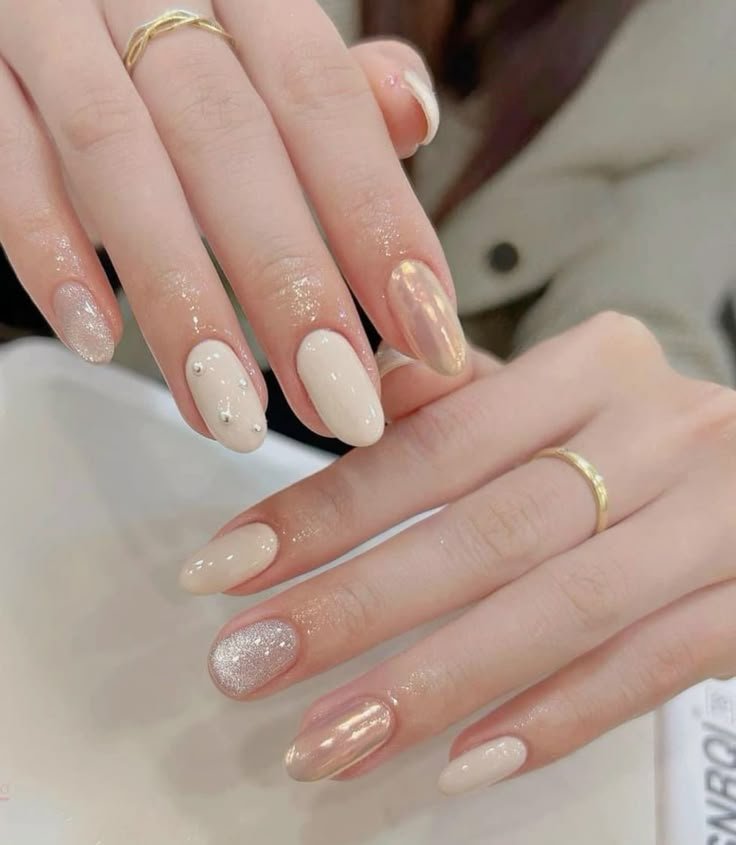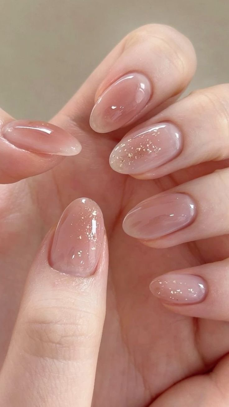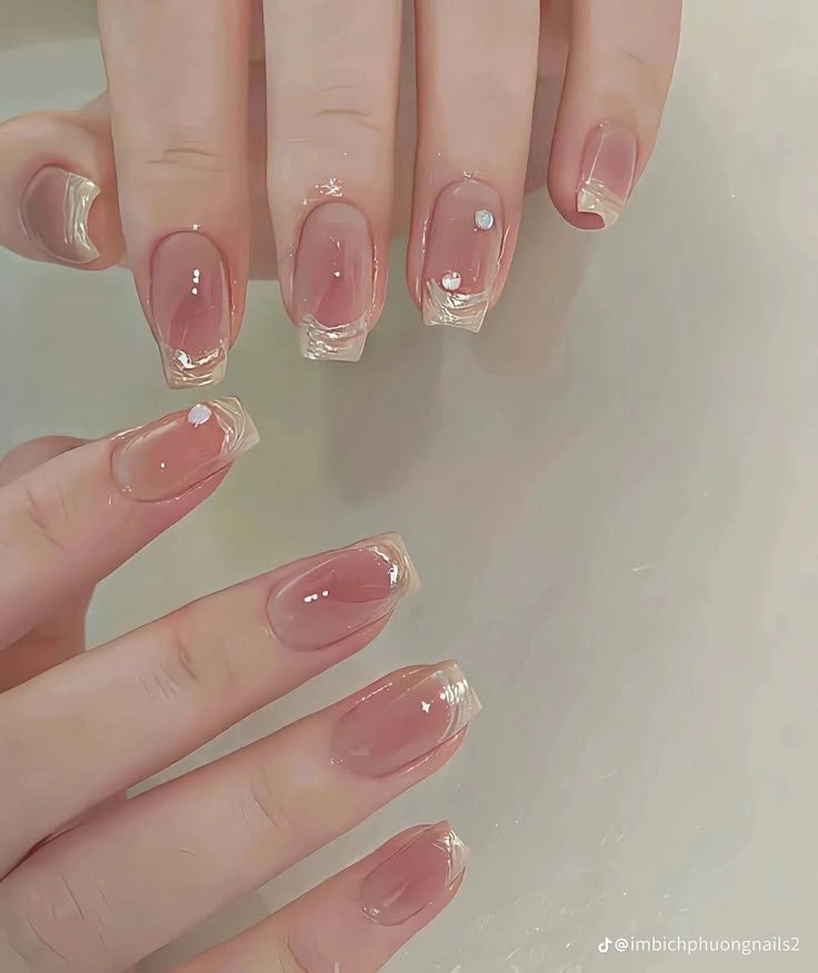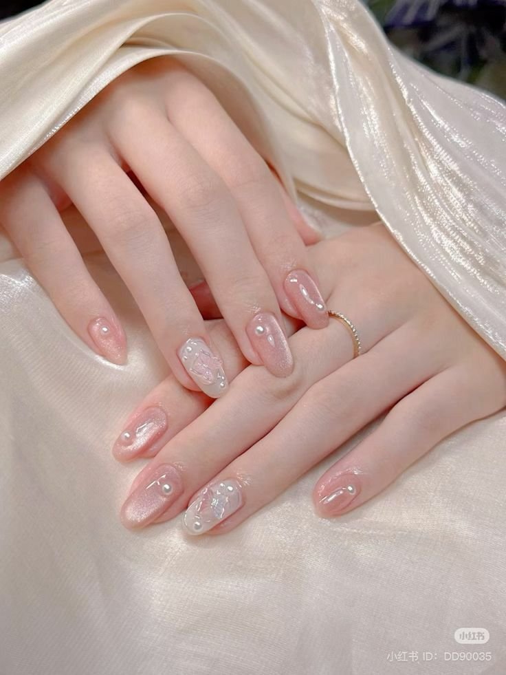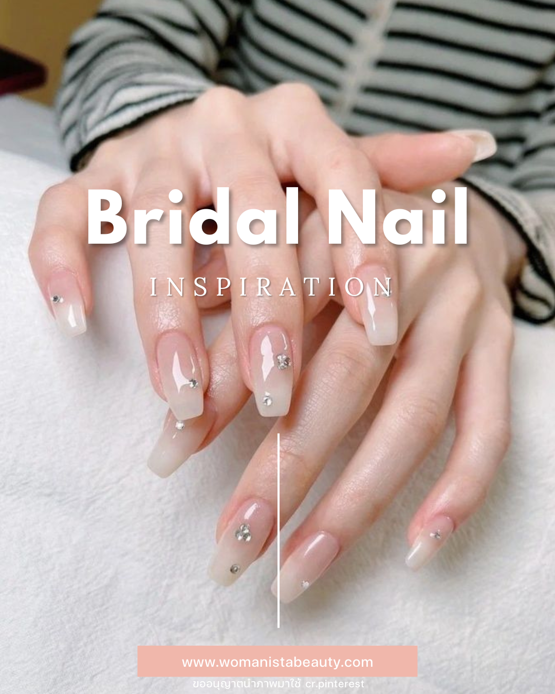 สวยหวานแบบมีประกาย ✨ ด้วยโทนพีชชมพูละมุน เพิ่มลูกเล่นกลิตเตอร์ใสสลับเพชรเม็ดเล็ก ให้มือดูนุ่มนวล มีเสน่ห์แบบเจ้าสาวยุคใหม่
